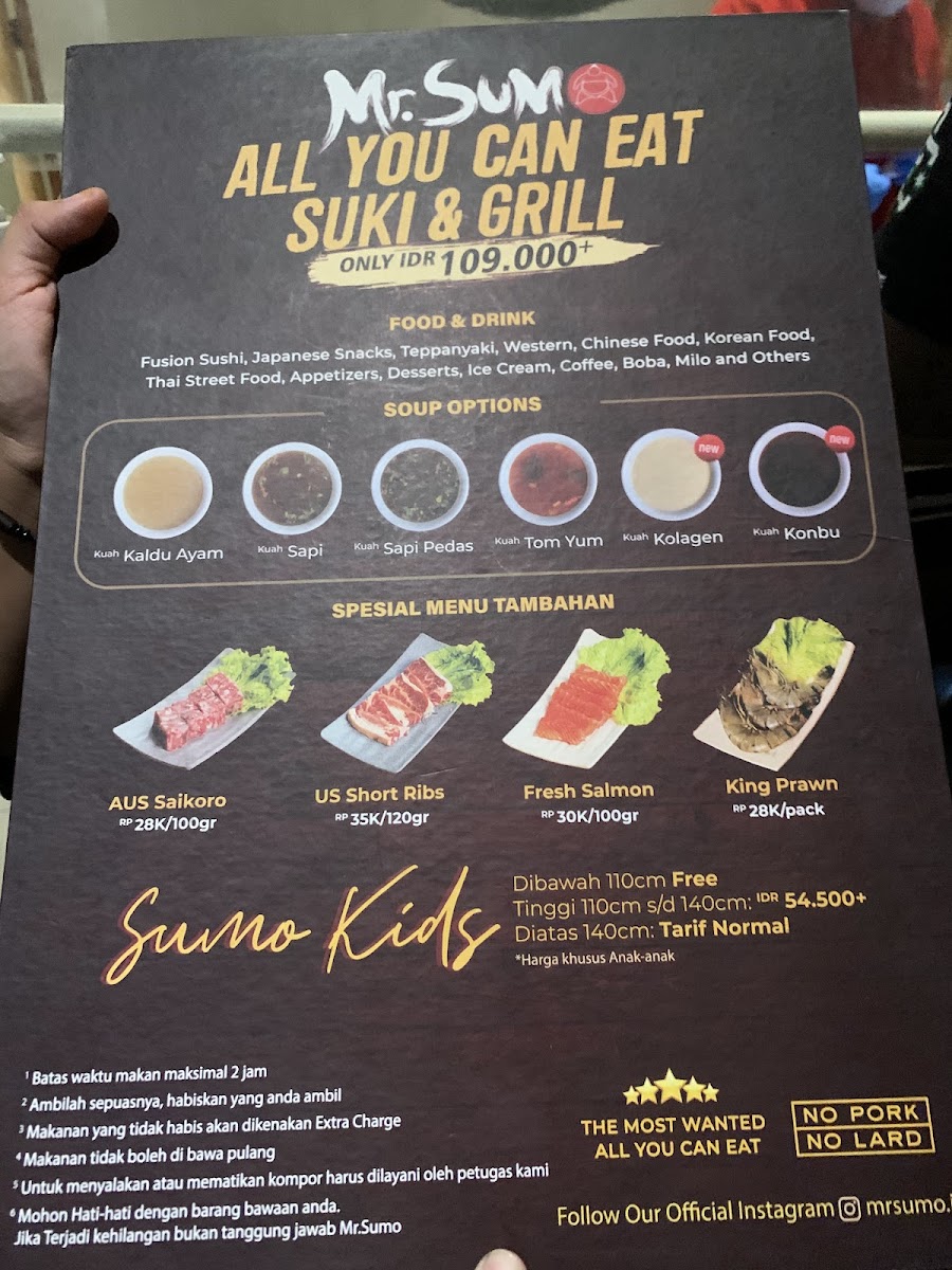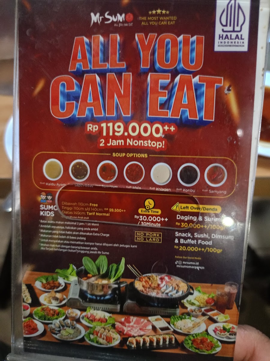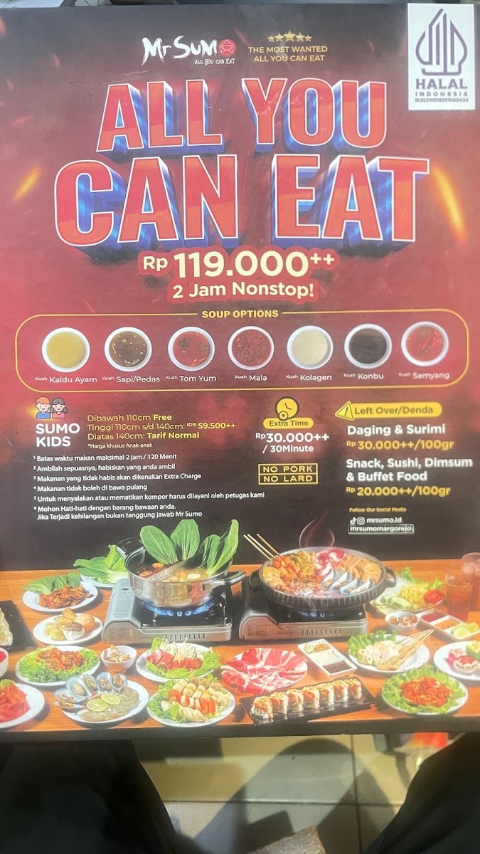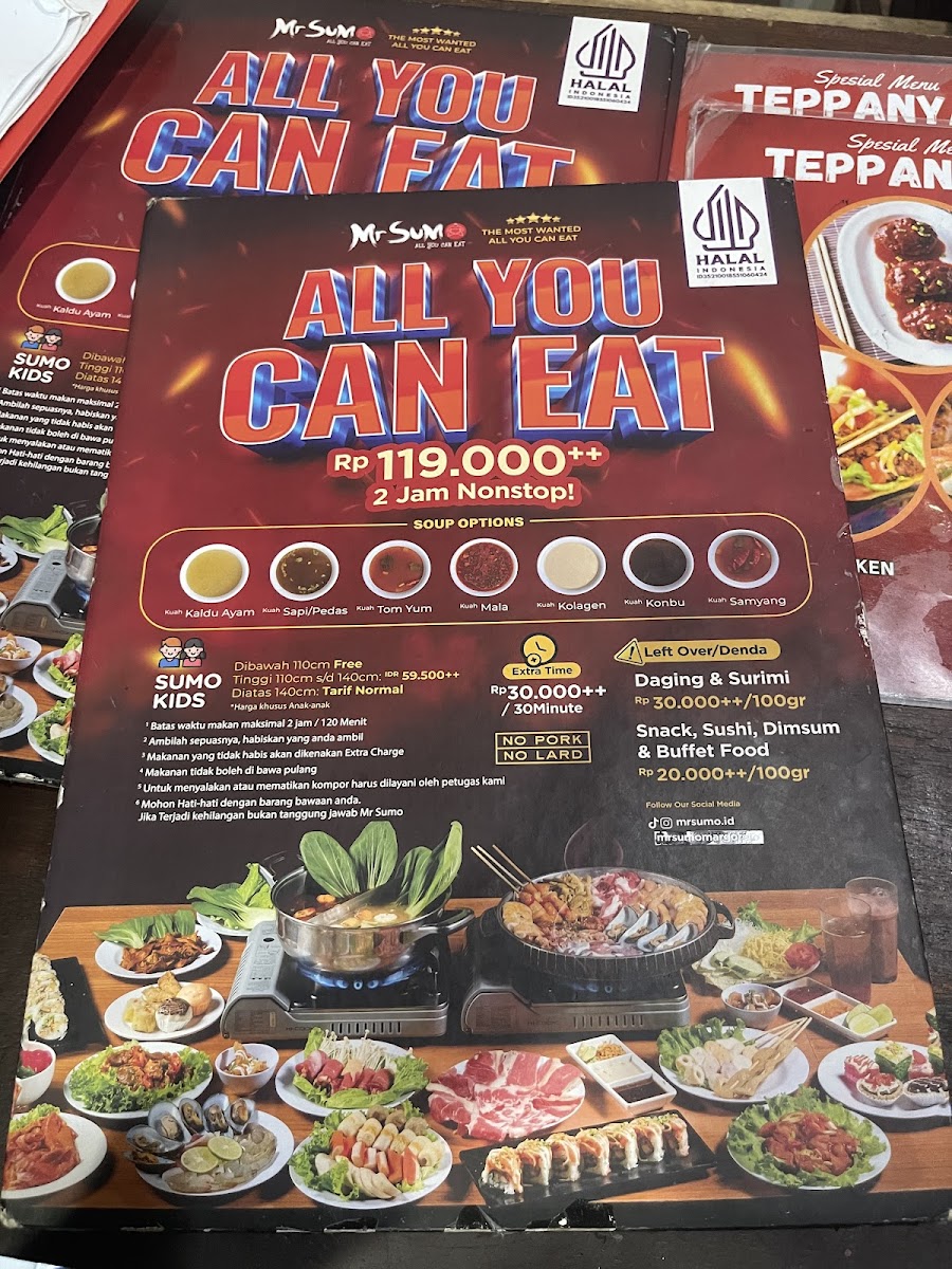 Mr. Sumo offers an impressive all-you-can-eat dining experience for just IDR 137,445, inviting guests to indulge in a diverse spread of Japanese-inspired cuisine. From the sizzling charcoal-grilled barbecue and delicate shabu-shabu hot pot to expertly prepared teppanyaki and fresh sushi, this Surabaya gem ensures every palate is satisfied. The menu highlights a rich variety of proteins – succulent chicken, tender beef slices, and fresh seafood – all ready for guests to either grill or cook in flavorful broths.